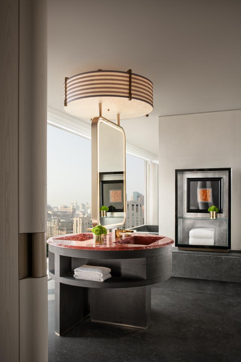 The K2 room employs a winding layout that separates the sleeping and bathing areas with semi-open partitions. Guests can gaze out at the river through the floor-to-ceiling window, immersing themselves in the changing rhythms of the city in a dreamy state of half-awake reverie.