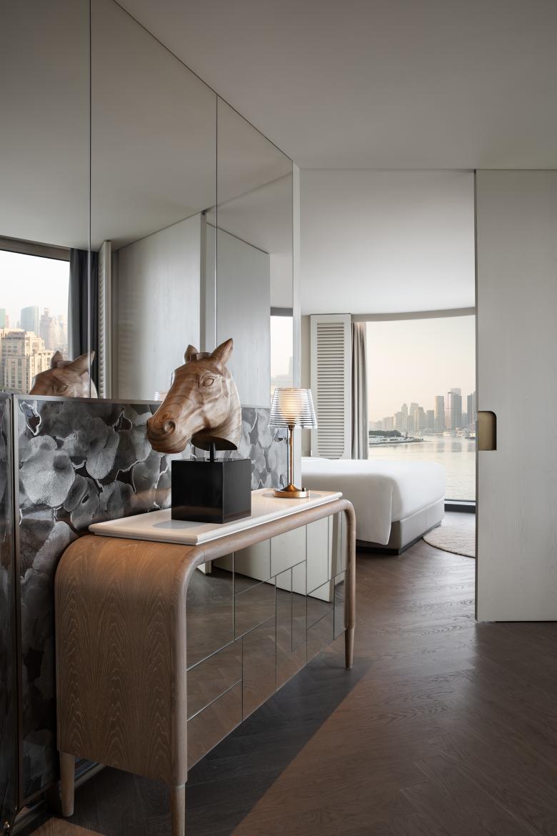 The hotel stands out at the confluence of two rivers, its gleaming facade evoking crystal and brass. The stretching fan-shaped south facade offers panoramic vistas of the riverside viewing platform, the historical architectural richness of the Bund, and the futuristic skyline of Lujiazui, unfolding the city's grandeur and beauty.