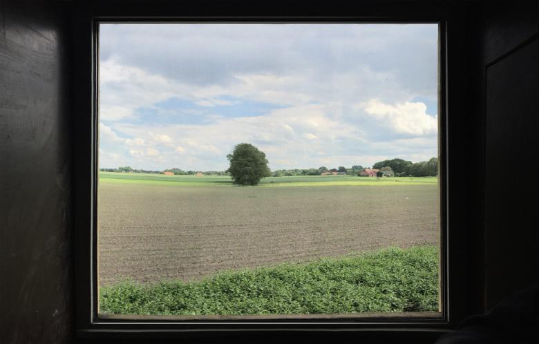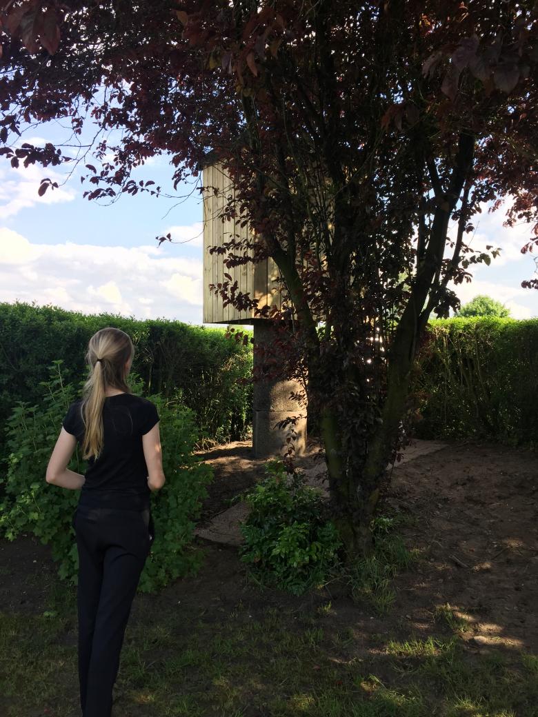 Das Baumhaus ist über eine Leiter und durch eine kleine Tür zu erreichen. Aufgrund der Höhe und einem Fenster, öffnet sich der Innenraum in die Landschaft.
