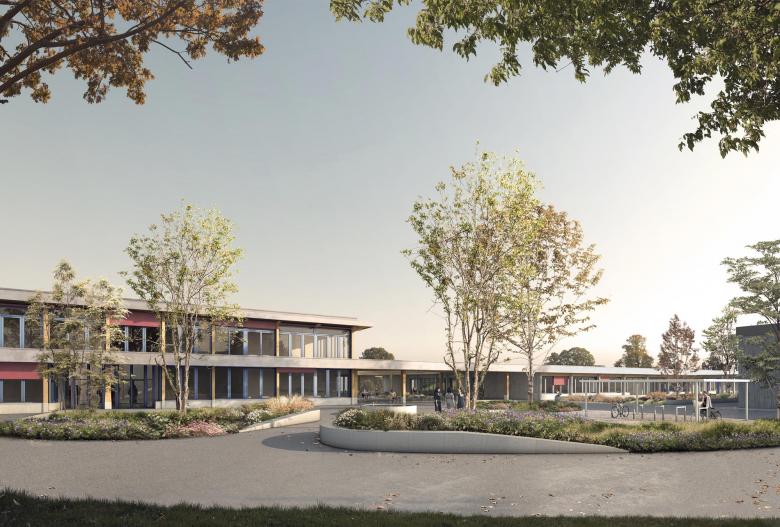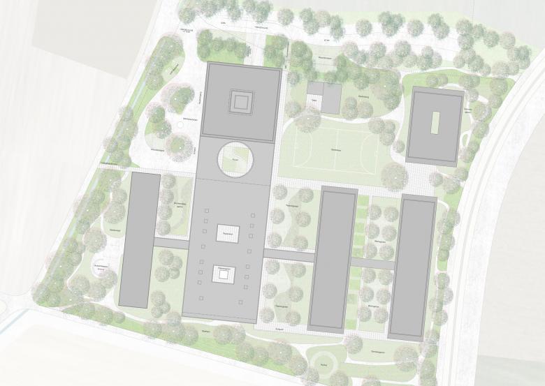 Der Fokus der Weiterentwicklung liegt auf der Klärung der Bedeutung des Schulgebäudes innerhalb der Gesamtanlage sowie der Ausformulierung einer repräsentativen Ankunft. Mit der Ergänzung zweier Elemente wird die Anlage neu geordnet. Einerseits schliesst ein zweigeschossiger Neubau die Anlage räumlich ab und bildet so eine klare Ankunft. Andererseits wird mit dem überdachten Durchgang (Forum) ein Verbindungselement geschaffen, welches den Neubau, das Schulgebäude und den Rest der Anlage zusammenbindet.