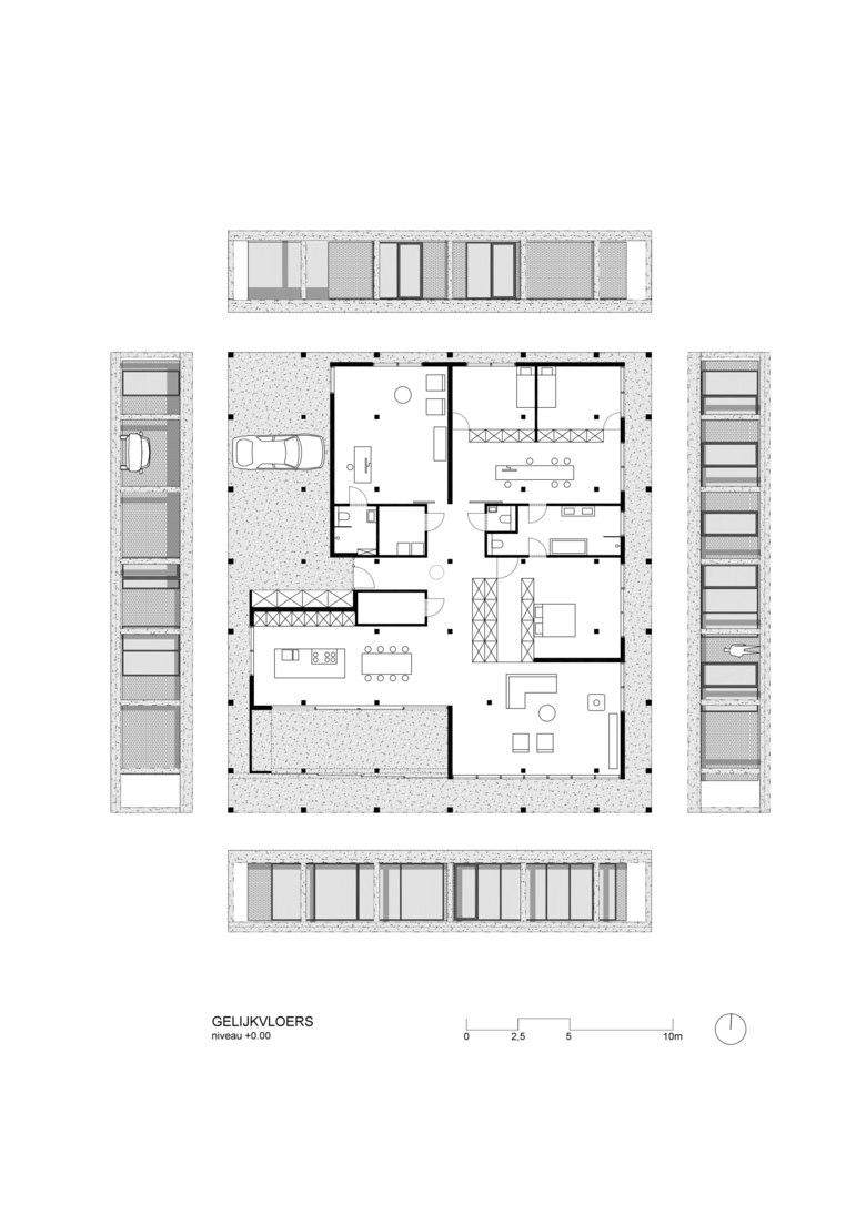 Er zijn dan ook geen echte voor-‐ of achtergevels, de woning richt zich naar de 4 zijden op 4 manieren.