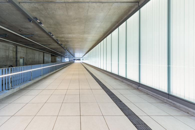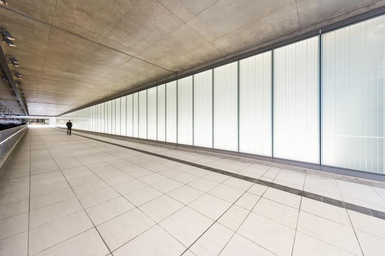 Die großen Treppenportale in der Verteilerebene sind durch das einfallende Tageslicht sowie in Nachts durch künstliches Streiflicht aufgehellt und dadurch gut ablesbar.