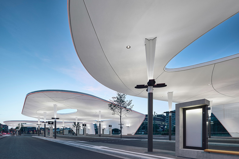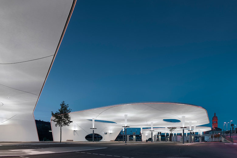 Flächenstrahlern an den Stützen, in Form von „Leuchtenblättern“ fluten die Deckenflächen mit Licht und sorgen für ein helles und freundliches Erscheinungsbild des Bauwerks. Die Flächen werden durch orange-farbige Lichtbänder umrandet. Sie betonen die dynamische, signifikante Form der Dachkontur und unterstützen die besondere Identität des Bauwerks, das einen Blickpunkt auf dem Bahnhofsareal bildet.