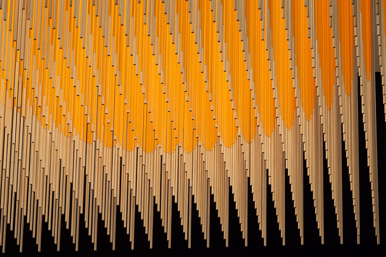 Die riesigen Metallskulpturen sind Blickpunkte, Highlights, sichtbar von außen und innen, und bilden dabei zentrale, verbindende Elemente. Jedes der drei Objekte besteht aus 1024 Edelstahlstäben, welche zusammen einen Würfel mit zwei Meter Kantenlänge bilden. Dabei sind die Stäbe in Gelb und Orange, angelehnt an die Farben eines Sonnenunterganges, so lackiert, dass sich in den Würfeln jeweils eine Kugel abbildet. Die Objekte zeugen gleichermaßen von einer Schlichtheit und Präzision wie von einer intensiven dreidimensionalen Wirkung, die für die Objekte des Bildhauers Miura typisch ist. Die Verbindung mit Licht intensiviert dies, bringt die Objekte zum Leuchten und verbindet sie mit dem Raum. Die eigens für das Objekt gefertigten LED-Spots wurden nach präziser Berechnung oberhalb des tragenden Gitterrostes angeordnet. Durch die engstrahlenden und exakt entblendeten Lichtoptiken leuchten sie die farbige Kugel aus und werfen wie ein Sonnenstrahl einen Lichtfleck auf den Boden. Besonders in Verbindung mit Wind, der die Metallstäbe in Schwingung bringt, entsteht dabei ein dezentes Schattenspiel.