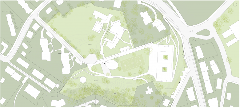 Neubau mit 12 Klassenzimmern als Tagesschule, Bibliothek / Mediathek, Mensa, Mehrzweckraum / Aula, Doppelturnhalle, Kindergarten, Pausen- und Sportplätze