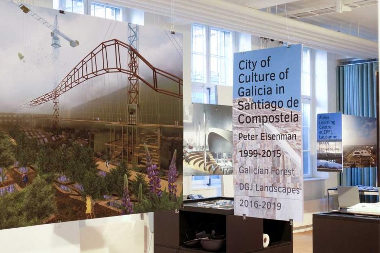 Wie entwerfen Architekt*innen eigentlich Landschaften? Diese Frage stellte sich Daniel Jauslin für seine Doktorarbeit, die er 2019 an der TU Delft erfolgreich verteidigen durfte und die das Gerüst der Ausstellung bildet. Anhand von drei Fallbeispielen werden Aneignungen von Entwurfsstrategien der Landschaft in der Architektur analysiert. Visualisierungen und ein VR Rundgang zeigen, wie Rem Koolhaas‘ ungebauter Jussieu-Entwurf für zwei Universitätsbibliotheken in Paris von 1992 in gebauter Form ausgesehen hätte. Der Entwurf arbeitet mit gefalteten Geschossebenen, die eine innere Stadtlandschaft ausbilden. Peter Eisenman entwarf 1999 die Kulturstadt in Santiago de Compostela in einem Prozess der landschaftlichen Schichtung. Gezeigt wird neben einer zeichnerischen Analyse auch ein Vortrag des amerikanischen Architekten über das Projekt und ein Vorschlag für die Nutzung der ungebauten Oper als Baumschule von DGJ Landscapes. Die 3D-Filminstallation von Wim Wenders des Rolex-Learning-Centre der EPF Lausanne präsentiert die Leselandschaft der Universitätsbibliothek. Die Architekten SANAA entwickelten ein Gebäude, bei welchem die innere und äussere Landschaft eindrucksvoll miteinander verschmelzen, was auch in einem spektakulären Wettbewerbsmodell von 2004 zu sehen ist.