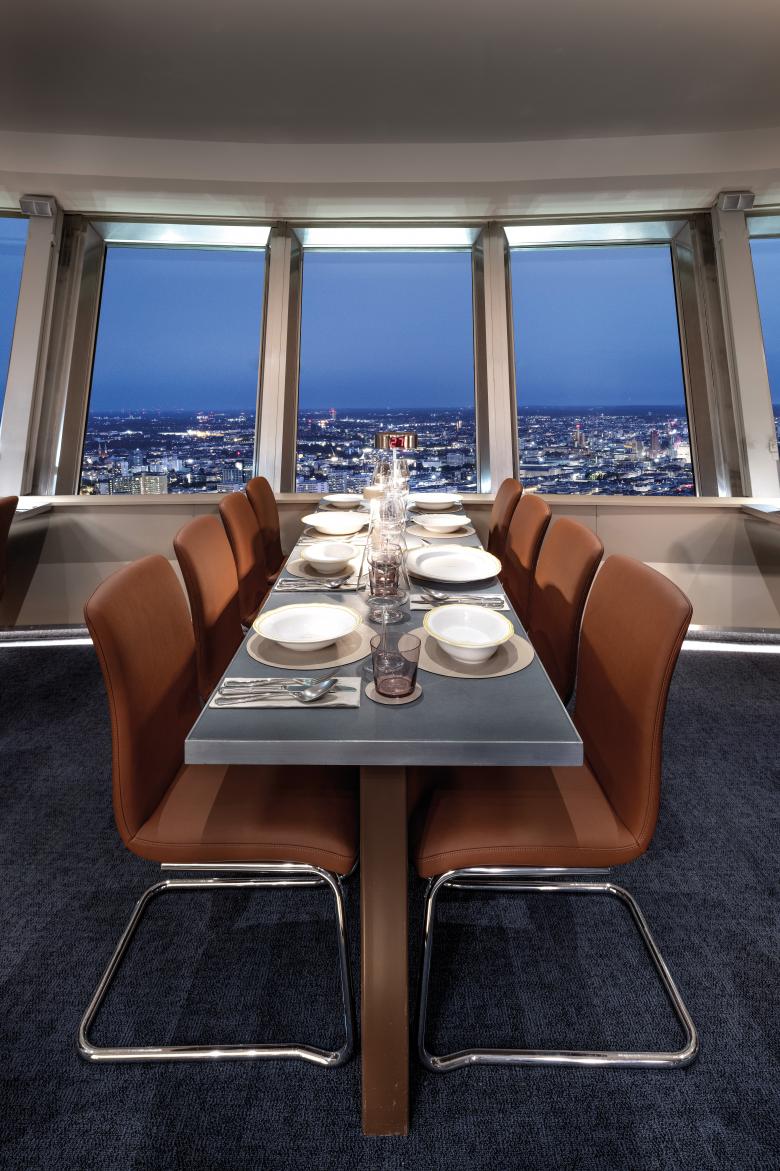 Rotating 207 metres above the German capital, the Sphere Tim Raue restaurant adds a new architectural, culinary and cultural dimension to Berlin’s iconic TV Tower. The listed tower sphere is now home to a place that preserves history while also exploring new horizons. A holistic interior design concept by Dittel Architekten and the culinary signature of renowned chef Tim Raue fuse together to create a space that is so much more than a restaurant – and which has its own unique atmosphere and international flair.