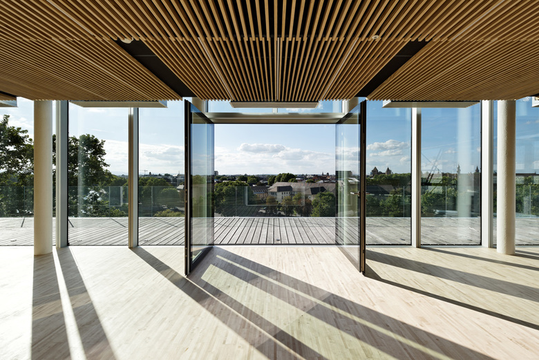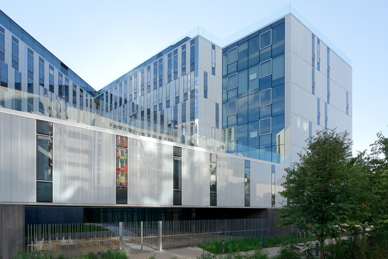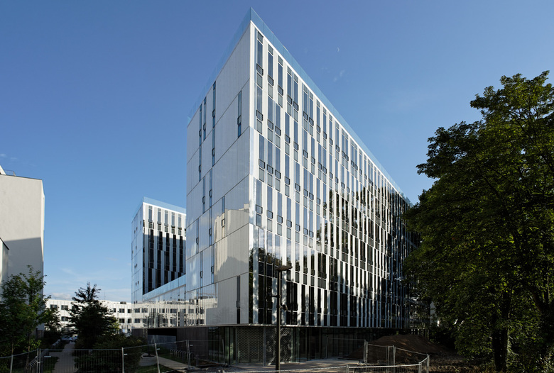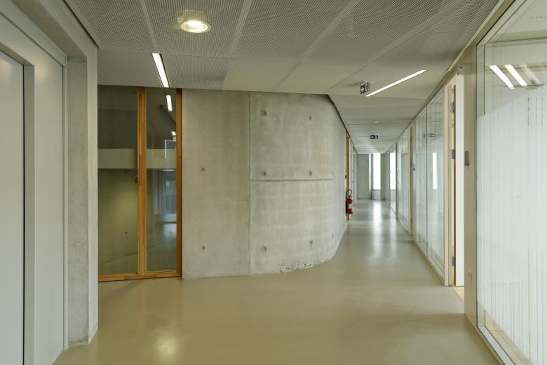 Le volume en forme de « U » se développe sur 7 niveaux et un attique, autour de jardins privatifs. L’ouverture du rez-de-chaussée sur l’allée paysagée reliant la rue avec le parc crée une relation forte entre les cheminements publics et le jardin intérieur. Ici se situe l’entrée du personnel. La salle du Conseil au R+1 forme un pont entre les ailes latérales nord et sud du bâti. Elle crée un porche protégeant l’entrée du personnel et les stationnements vélos et soutient un jardin au R+2. Le rapport au paysage est privilégié, tout comme l’intégration au site. La façade reflète le ciel et le paysage environnant.