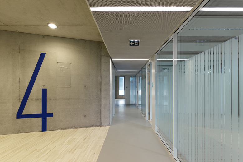 Les parties centrales (boxes d’échanges, zones de rangement, reprographie) et les circulations profitent de la lumière naturelle grâce aux cloisons vitrées des bureaux. La sérigraphie des vitrages crée un filtre entre les bureaux et la circulation et assure l’intimité des espaces de travail.