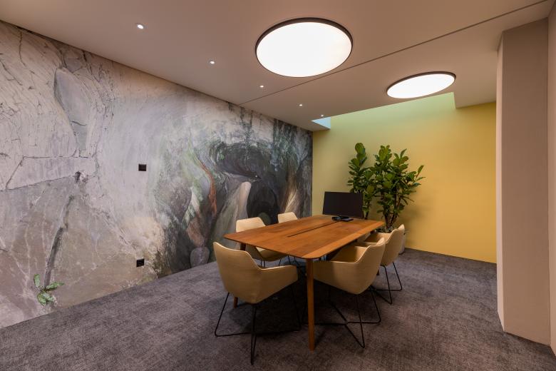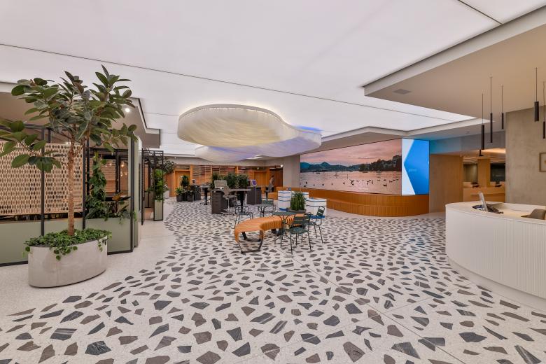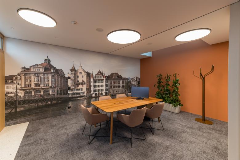 Wir haben typische Elemente aus dem urbanen Raum aufgegriffen und die städtische Umgebung geschickt in das Lobby Design integriert, ohne dabei aufdringlich zu wirken. Dazu gehören eine Deckenwolke mit dynamischer Lichtinszenierung und ein Terrazzo-Boden mit städtischem Flair. Der Boden trägt übrigens buchstäblich ein Stück Luzern in sich: LUKB-Mitarbeiter:innen platzierten persönlich Bruchsteinelemente vor dem Giessen.