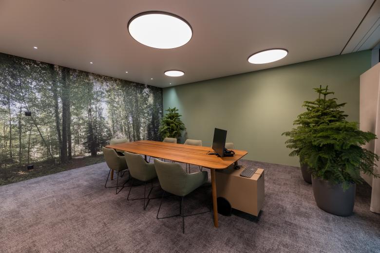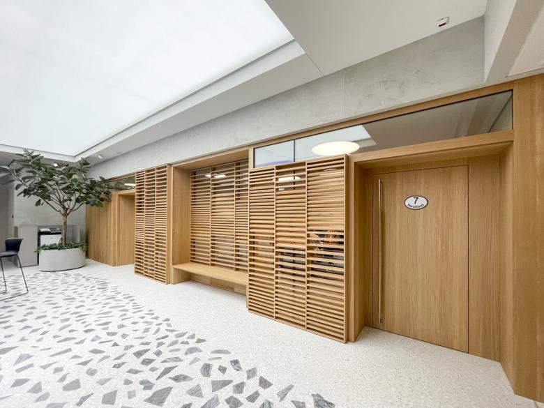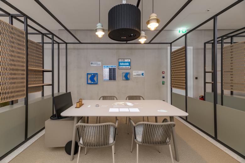 Für schnellere Transaktionen stehen flexible Beratungstische zur Verfügung. Diskretere Gespräche finden in Beratungszimmern und in drei Pergolen statt. Das Pergola-Design erinnert an die Innenhöfe der typischen Blockrandbebauung. Urbane Relikte und gezielte Begrünung verleihen diesen Räumen zusätzlichen Charakter.