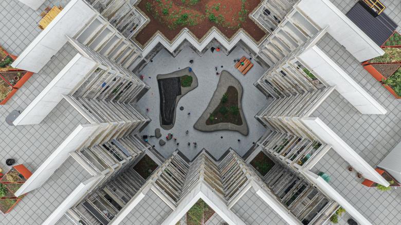 Für das letzte Baufeld (B4) auf dem Areal ist ein Wohnhaus geplant. Vorgeschlagen wird ein kompaktes Volumen, welches sich U-förmig zum zukünftigen Park hin öffnet. Am Geistlichplatz entsteht mit einem leicht zurückversetzten Eingang eine übersichtliche und selbstverständliche Adressbildung.