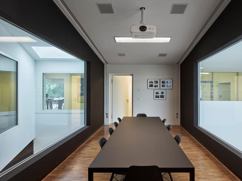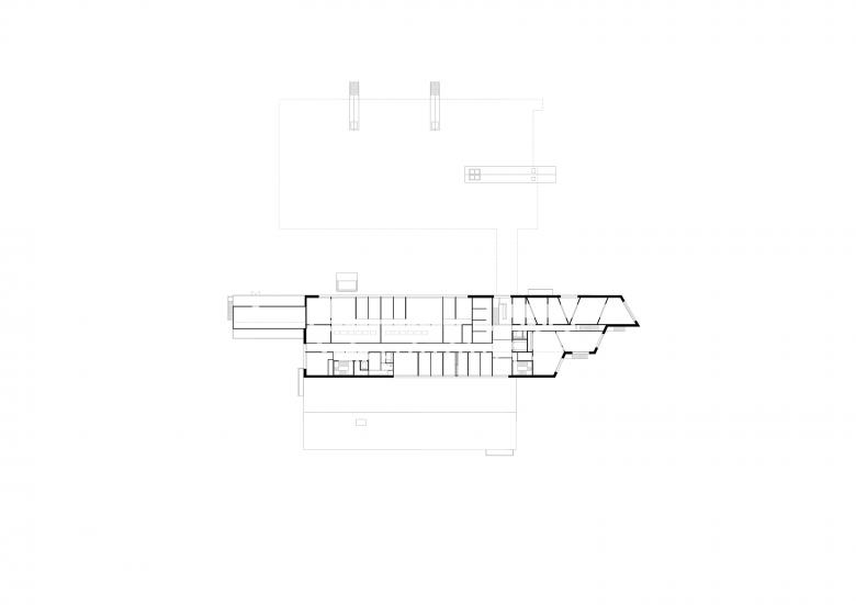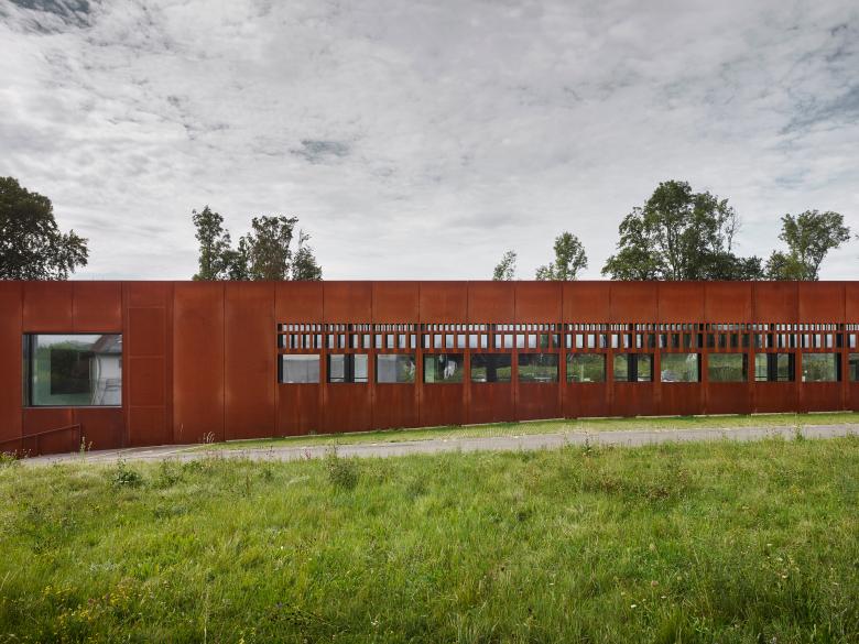 Paradoxically, the charm of the existing Cinémathèque lay in its simple and utilitarian appearance. The home of the national collective film memory presented itself as an unpretentious accumulation of sheds that was focussed more on contents than on packaging. The extension project accepts this starting point and makes it its own. The layout of the existing buildings which are arranged linearly alongside each other is translated by new additions and remodelling into a composite, ambivalent form of parallel buildings of different lengths. Only the end situation is differentiated by making a number of angled cuts; in this way the building acquires a face. The principle of placing buildings alongside each other is evident in the interior, too. The three main circulation routes, which are placed above one another, pass through the parallel cross-walls at right angles, allowing the sequential arrangement of the ‘individual’ buildings to be experienced. The suspended conference rooms in the two-storey entrance and exhibition hall are in turn connected with each other by windows. When looking across and through the building this produces a perspective depth while also suggesting associations to filmic processes such as montage and cutting. While the public areas and all work places are concentrated in Penthaz I, the archive itself on the far side of the road is conceived as a purely underground storage space. In this way the functional and atmospheric side effects are restricted to an absolute minimum. Penthaz II is a kind of super-functional bunker that ensures the best possible protection for the culturally valuable artefacts. In a simple manner a kind of urban disposition is achieved that, on the one hand, reacts to the expansiveness of the nearby agricultural landscape and on the other gives Cinémathèque suisse as an institution an emphatically clear address. The new envelope of rusted steel, an industrial material that emanates a sensual quality, encases the entire complex and binds the new and the existing parts together. The gradual weathering of this natural material is a reference to the archive’s function in preserving film and gives the complex a differentiated identity of its own. The modulated, condensed roofscape composed of gently sloping, planted roofs takes up the theme of industrial production facilities or film studios.