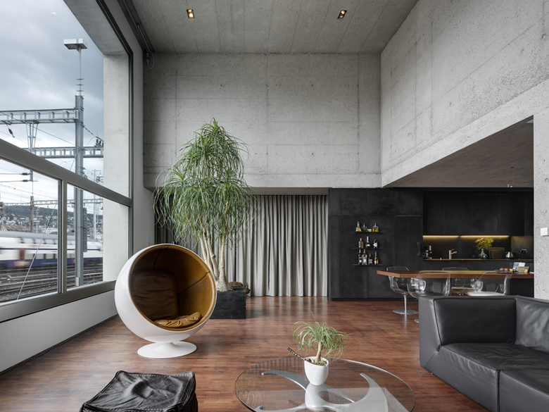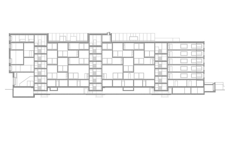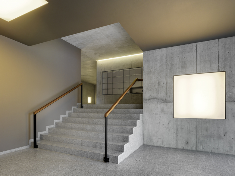 The building responds to the external circumstances with a layered structure. The south-facing bedrooms and loggias look onto the quiet courtyard. Entrance halls, wet rooms and cloakrooms are centrally positioned. Living and dining areas profit from the breadth of the area of tracks and some are double height. Access to the building and the three staircases is from Langstrasse and from the courtyard through a naturally lit plinth level.