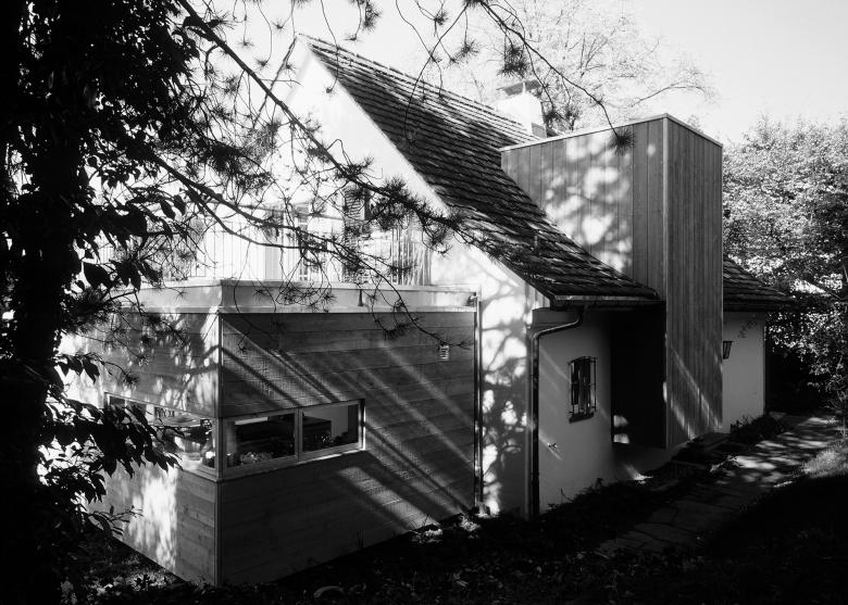 Da das kleine, charmante Wohnhaus aus den 40er Jahren, auf einer Geländeterrasse über dem Zürichsee gelegen, nicht mehr den aktuellen Bedürfnissen entsprach, musste es angepasst und erweitert werden. Die Entwurfsabsicht bestand darin, die alte Struktur beizubehalten und durch zwei verschiedene, präzis definierte Eingriffe zu ergänzen: Zum einen den eingeschossigen, horizontal orientierten Baukörper seitlich der Südfassade, der die Küche und das Esszimmer beinhaltet; zum anderen das vertikale Volumen mit der Erschliessung. Der horizontale Baukörper zeigt eine waagrechte Schalung mit einem tiefliegenden, seitlichen Eckfenster. Das vertikale Volumen weist eine senkrechte Schalung mit einem Oberlicht auf. Der unterschiedlich natürliche Lichteinfall und die Art, wie sich die einzelnen Räume zum Aussenraum beziehen, verstärken deren unverwechselbare Identität. Um das Wohnhaus in seinem stimmungsvollen Charakter nicht zu beeinträchtigen und um es in seiner Dominanz zu wahren, wurden zurückhaltende Materialien und Farben gewählt. Bewusst wurde eine leichte, schwebende Erscheinung der Volumen gewählt, um das bestehende Wohnhaus in seiner Dominanz zu wahren.