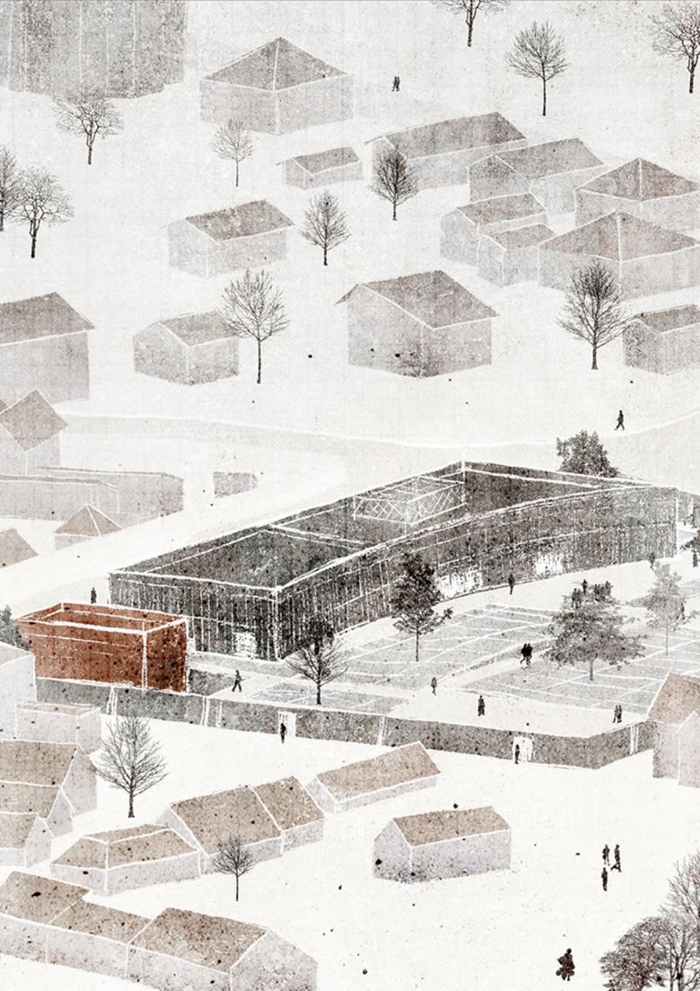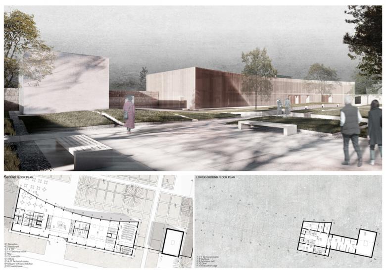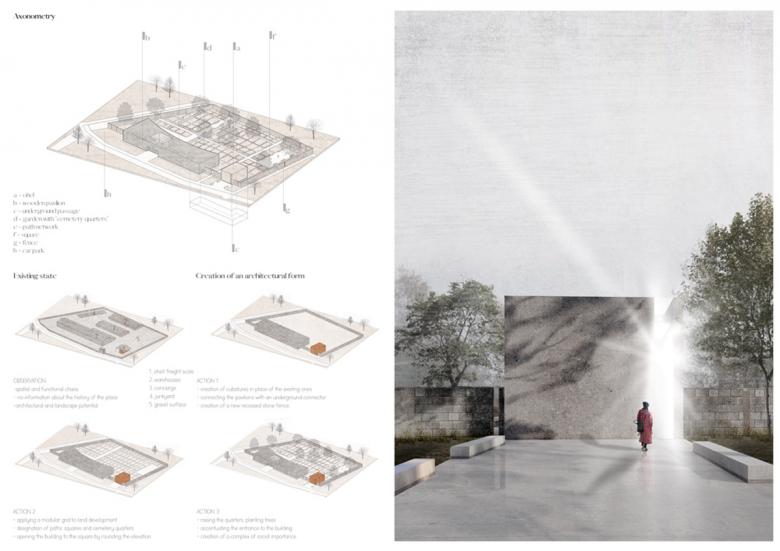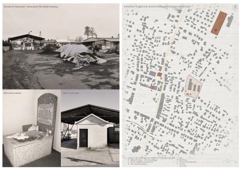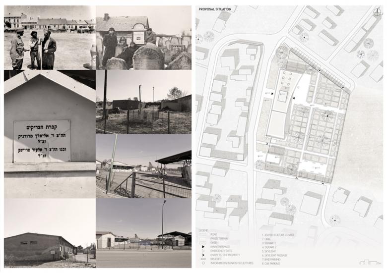 The project is an approach to the revitalization of the difficult area of the former Jewish Cemetery. The narrative takes place in a small town where the terrain is taboo. It challenges how to combine the past and the present into a new future, while respect for the sacred. It assumes that designing on a local scale plays a key role in reducing disinformation.