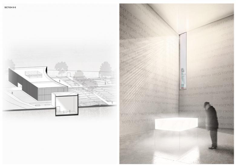 The project assumes the introduction of a completely new function on the area of the entire plot. The designed cubatures are located in the place of the existing ones, in order to disturb the existing sacred area as little as possible. The concept assumes the use of the potential of a large area under the Center for Jewish Culture. The unit will become an institution that will research the history of places associated with the Judaic religion. At the same time, it will pass it on to the local population, thanks to the space allocated for individual study (reading room, permanent exhibition) and larger gatherings (lecture hall, squares, garden). The Jewish Culture Center will become a link between history and the present. It will give a great chance to arouse tourist interest, and thus increase the education of the society. However, the most important moment in the entire premise is Ohel, which has undergone a complete metamorphosis. Its interior has become a treasure that needs to be protected and cared for. Only the followers of Judaism have access to it. The road they have to travel is mysterious and leads to a state of concentration and prayer. Before entering the facility, Hasidim can give thanks or wishes on special installations in the underground link between the Center Pavilion and the Ohel. In the middle of the room there is an illuminated marble slab commemorating the great tzaddikim. The names of the Jews who were buried in this cemetery were engraved in the concrete on the walls. The garden is also a reference to the history of the place. On the modular grid, the greenery was divided in such a way that it resembles cemetery quarters. This procedure is to remind us in a very obvious way what has really been happening in this area since the 17th century. The design in every aspect is saturated with symbolism that can be interpreted in many ways. It also discusses the topic of how local design affects the change of attitudes of a given community, and what opportunities it gives them for the direction of development.