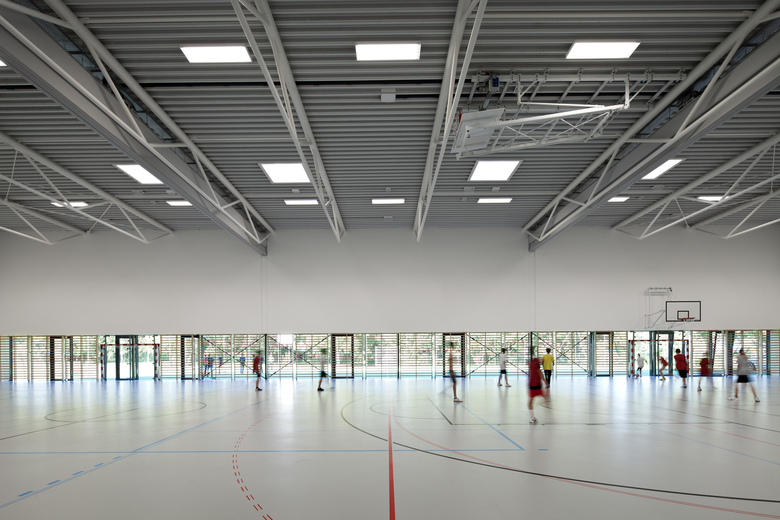 In den Umkleideräumen, Duschen und Toiletten im hinteren Teil ziehen sich die SchülerInnen für den Sportunterricht um und laufen auf direktem Wege, auf gleicher Ebene, zu einem der zwei angrenzenden Turnhallen oder den Sportplätzen ins Freie.