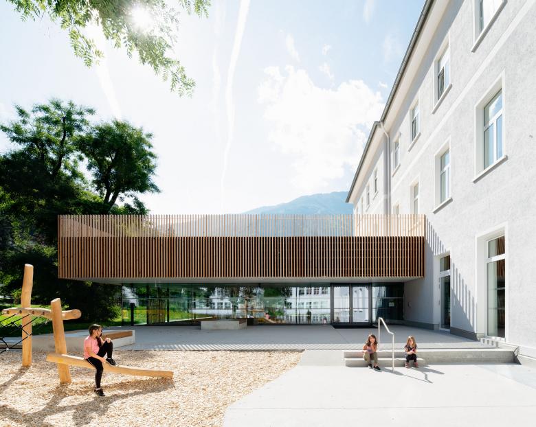Die hundert Jahre alte, denkmalgeschützte Volksschule mitten im Zentrum der Tiroler Bezirkshauptstadt Landeck brauchte dringend ein Update: viel mehr Platz für die SchülerInnen, größere Transparenz und eine neue Raumorganisation, die zeitgemäße Lehrmethoden möglich macht.