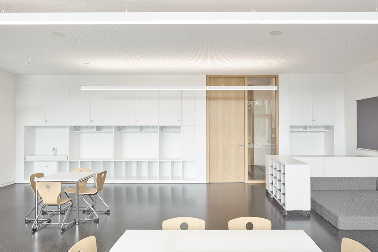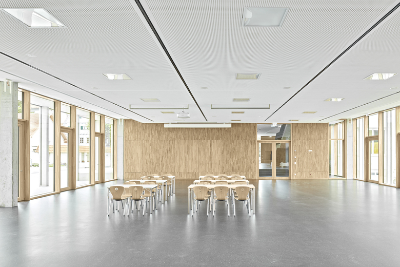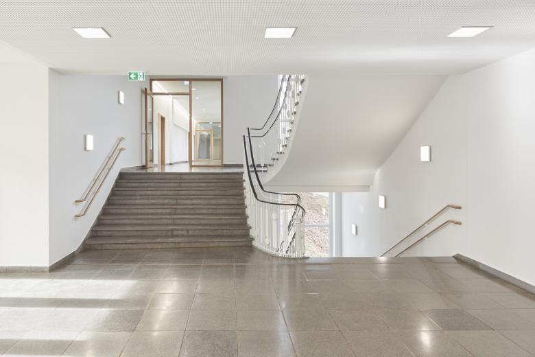 Gebäude - Über eine neue Eingangssituation gelangt man in den längsorientierten Neubau. Dessen zweigeschossiger offener Erschließungsbereich dient als neuer zentraler Verteiler für alle 3 Bauteile. Unmittelbar daran angeschlossen sind im Eingangsgeschoss des Neubaus ein Veranstaltungssaal für 300 Personen der auch als Mensa genutzt wird, in der oberen Ebene der Ganztagesbereich, im Jahrhundertwendebau der Lehrer- und Verwaltungsbereich und barrierefrei über die 2 Neubauebenen erreichbar die Klassentrakte im Fünfzigerjahre Bau. Als Zusatznutzen der neu organisierten Erschließungsstruktur wird die ansonsten erforderliche hohe Anzahl zusätzlich notwendiger Fluchttreppen deutlich minimiert, freistehende außenstehende Fluchttreppen an den Altbauten sind nicht erforderlich.