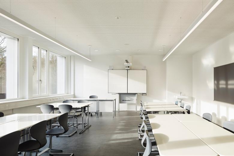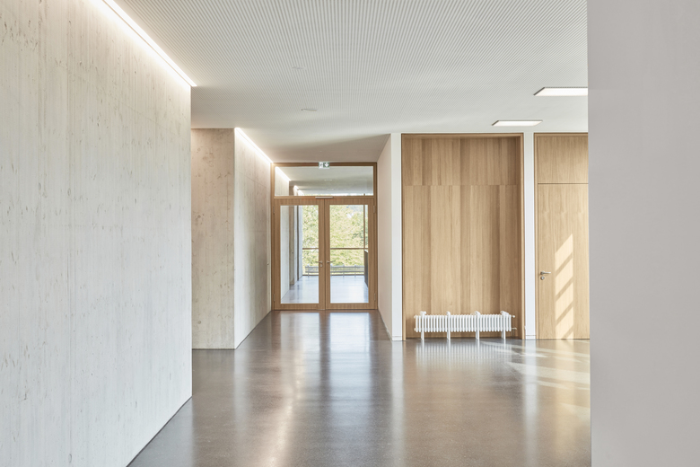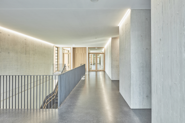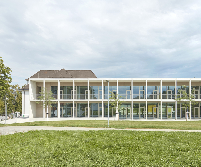 Bauweise und Energiekonzept - Die gewählten Konstruktionen und Materialien folgen der Zielsetzung robuste Oberflächen mit hoher Materialeigenwertigkeit und haptischer Erlebbarkeit zu kombinieren. Die im Passivhausstandard realisierte Neubaufassade wird geprägt von den sandgestrahlten Betonfertigteilen der Kolonnaden sowie einer präzise gefertigten Holzbekleidung. Im Gebäudeinnern dominieren brettgeschalter Sichtbeton, naturbelassene Massivholzoberflächen, Schwarzstahl und ein oberflächenfertiger Gussasphaltbelag. Der energetische Standard des Neubaus ist mittels kontrollierter Lüftung und den thermisch entkoppelten vorgesetzten Bauteilen in der Nähe des Passivhausstandards angesiedelt, die Sanierung des Fünfzigerjahre Baus, die im Rahmen des zweiten Bauabschnitts erfolgt, umfasst eine grundlegende energetische Optimierung der baujahrstypisch nicht mehr zeitgemäßen thermischen Hülle. Den wichtigsten Baustein des energetischen Gesamtkonzepts bildet jedoch die Entscheidung die 2 Altbauten mit der darin gebundenen grauen Energie nicht abzureisen, sondern zusammen mit dem neuen Bauteil als Gesamtsystem in die nächste Nutzungsperiode zu überführen.