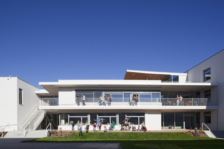 Entlang der Fassaden wird das Wechselspiel zwischen Außen und Innen zur gestalterischen Leitidee: Im Norden schieben sich Fensternischen weit nach außen und schaffen Raum im Inneren, im Süden vertieft sich die Fassade und schafft Balkone und überdachte Terrassenbereiche, die ein Lernen im fließenden Übergang zwischen Außen und Innen möglich machen.