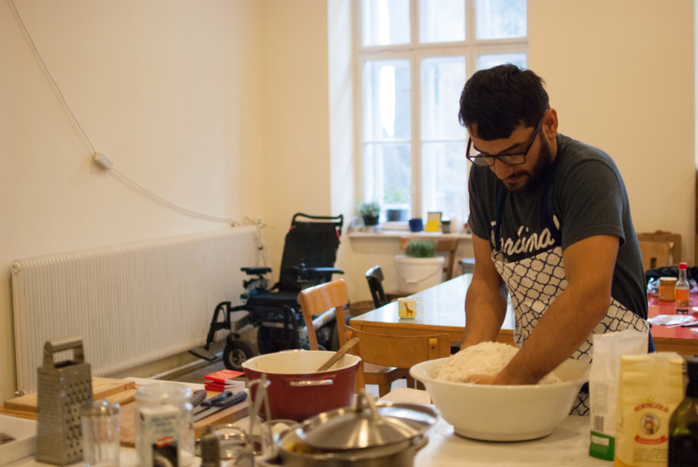 Das Haus in der Grundsteingasse ist auch ein intersektionales Stadthaus in doppeltem Sinn. Zum einen als Schnitt durch das Gebäude gedacht: Über alle drei Geschoße mitsamt der Stiegenhäuser gibt es eine zentrale Küche, keine einzelnen Wohnungseinheiten, sondern entweder großzügige kollektiv genutzte Räume oder kleine private Rückzugsräume. Die zweite, weniger räumliche Bedeutung von "intersektional" betrifft die Mitglieder, die aus teils queerem, teils migrantischem Umfeld kommen, die alle keine besonders wohlhabenden Menschen sind – aber jedenfalls solidarisch sozialisiert.