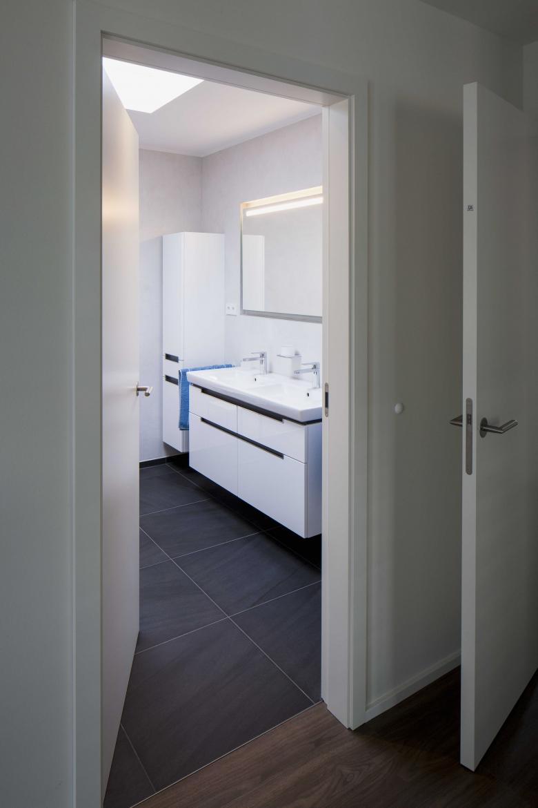 Unterstützend zu den versetzen Baukörpern, kommt eine differenzierte Fassadengestaltung zur Wirkung. Während jeweils ein Gebäudeteil mit heller Putzfassade gestaltet ist, bildet der angebundene Baukörper in dunkler Anmutung ein vergleichbares Pendant. Durch Terrassen, stehende Fensterformate und Balkone erhält die in ihrer Grundstruktur strenge Fassade eine spielerische Leichtigkeit und Individualität.