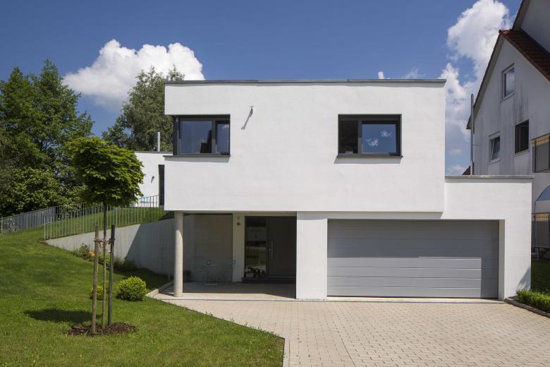 Auf Ebene null mit Hauseingang und Doppelgarage befinden sich Wellnessbereich, Gäste-WC, Gebäudetechnik sowie Abstell- und Kellerräume. Die Ebene plus eins mit Schlafzimmern und kombiniertem Küche-, Ess- und Wohnbereich besitzt raumhohe, großflächige Fenster, die das Gebäude zum leicht abfallenden Garten hin öffnen.