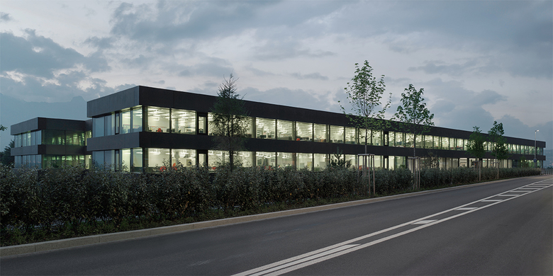 Die enge Vernetzung von Produktion, Forschung und Dienstleistung in einem Gebäude ist Grundlage des Raumkonzeptes und entspricht dem Anspruch der Firma Hilti. Herz der Anlage bildet die überhohe, stützenfreie Versuchshalle, welche einen optischen und funktionalen Beziehungsreichtum erzeugt.
