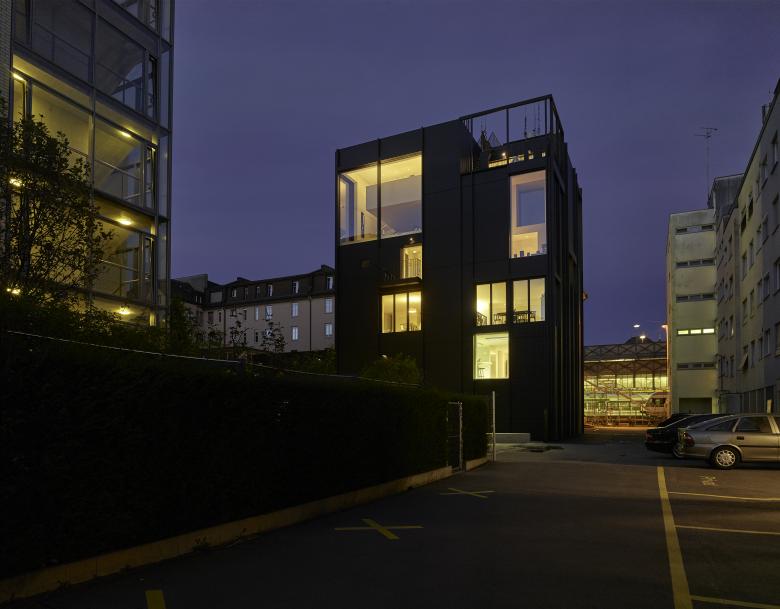 Vielseitige Nutzungsansprüche auf wenig Bodenfläche erfordern einen turmartigen, verschachtelten Entwurf für zwei grosse Wohnungen über drei Geschosse in den obersten Etagen, zwei Stadtwohnungen auf einem Geschoss sowie die Büroräumlichkeiten von Graf Biscioni Architekten mit räumlichem Bezug zur neuen Fussgängerzone an der Rudolfstrasse. Die kompositorisch gestaltete Fassade ist geprägt durch zweigeschossige Festverglasungen über Eck, welche den Wohnräumen und Küche der Grosswohnungen den Stadtblick ins Innere bringt und dem Gebäude einen spannenden Massstab zur Stadt geben. Die dunkle Farbwahl der Hülle soll sich in der heterogenen, dichten Stadtumgebung zurückhaltend auswirken und trotzdem die Ausstrahlung als «chices» Objekt im Zentrum von Winterthur haben.