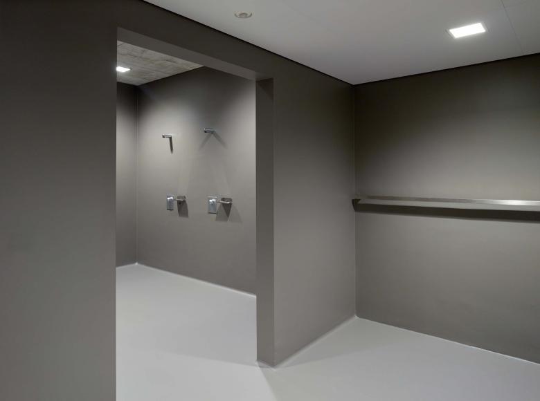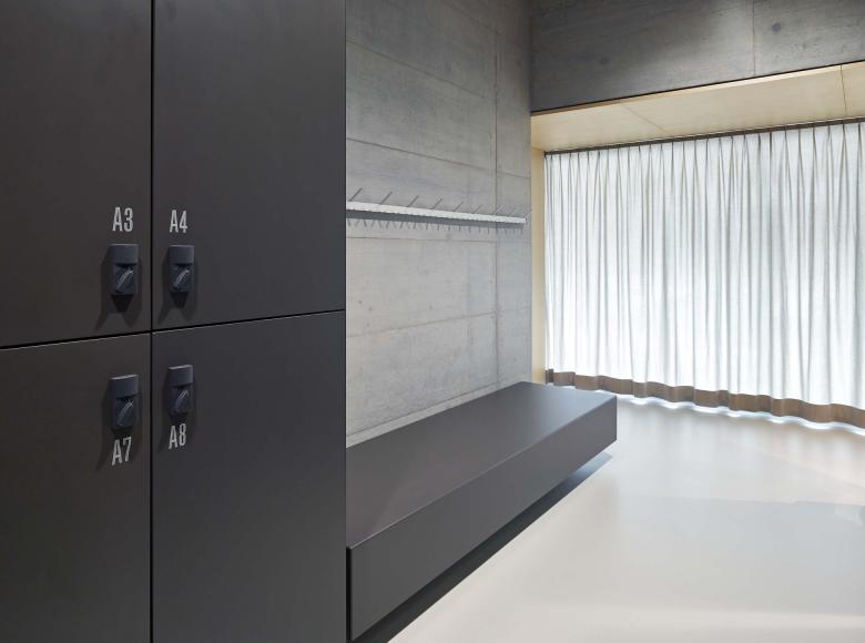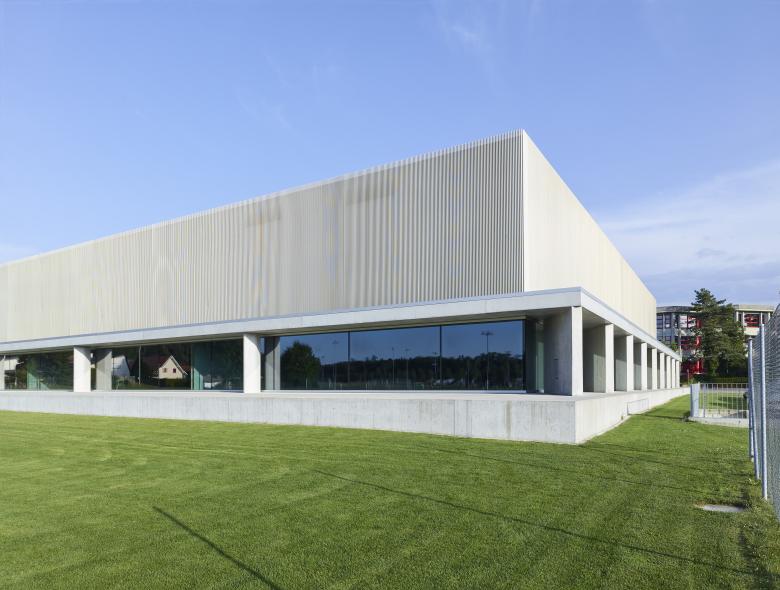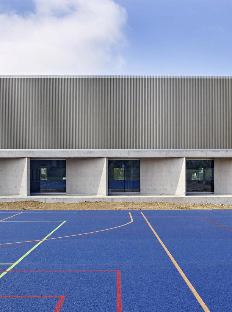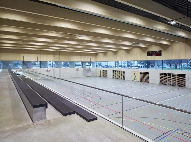 Durch das eingeschossige Versenken der Halle kann der Sportraum direkt über die Galerie betreten werden. Der dreiseitige Ausblick von der Galerie, macht den Aussenraum nebst dem Sportgeschehen ebenfalls zum Sicht-Erlebnis für den Besucher. Haupträume wie Mehrzweckraum, Lehrerzimmer und Office sind zum Pausenplatz sinnvoll und synergiefördernd platziert.