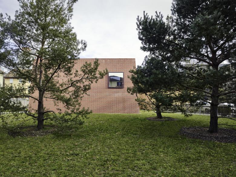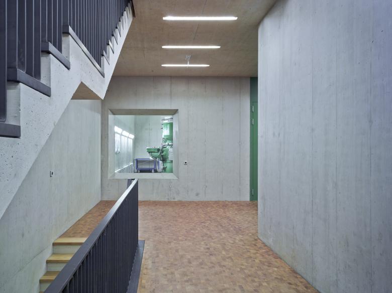 Wie die Spitze eines Eisberges ragt das Eingangsgebäude über dem Terrain heraus in den Hof, welcher als Entwurfsziel maximal «frei» für die Anwohner belassen und mit einer Wiese als Oase zur Atmung gestaltet wurde. Dieser Eingangsbau, welcher auf drei Unterterrain-Geschossen mit Infrastruktur steht, wurde mit Backstein als Referenz an die Industriegeschichte Winterthur verkleidet und die Gebäudeform leicht abgeschrägt, um einen speziellen Nutzungsinhalt anzudeuten. Ein Fenster in den Kommandoraum, eine Eingangstür sowie mit Kupferlamellen gestaltete Lüftungsöffnungen, analog den Kupferspindeln in den Trafos, gestalten die Fassaden abstrakt und kompositorisch aufeinander abgestimmt.