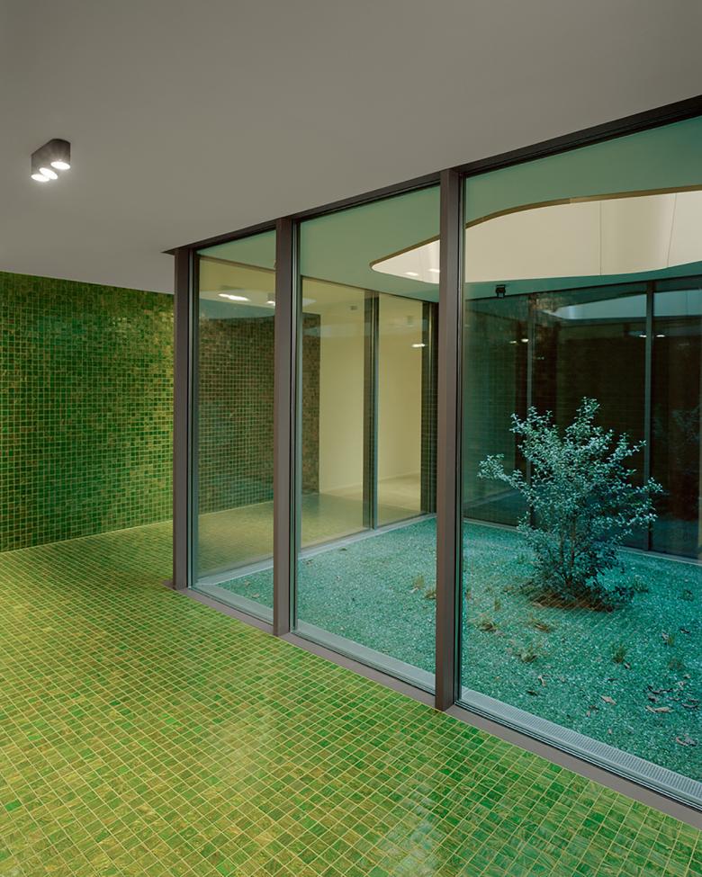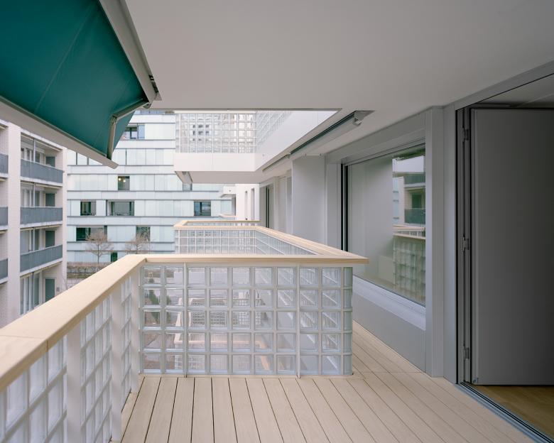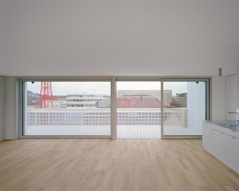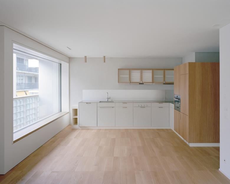 Präsent und prägnant zur Konradstrasse türmen sich die Wohnräume der Altersresidenz-Wohnungen mit symmetrisch zeichnender Fassadenfront. Die über die Verkehrsbaulinie entworfenen Terrassenauskragungen ermöglichen den Bewohnern den Strassenzug hinauf- und hinabzusehen und formen das Gebäude in eine zeitgenössische, selbstbewusste Stadterscheinung. Städtebaulich ist diese Front turmartig siebengeschossig präsent, wogegen die Wohnungen im Hof viergeschossig gestaltet sind um Luft und Freiraum für das Quartier mit einem neuen attraktiven Parkanteil zu bringen.