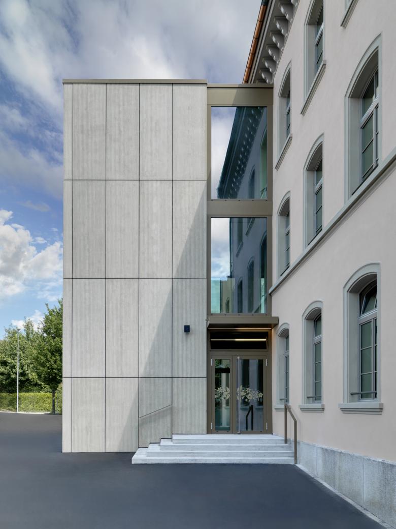 Das Schulhaus Schanz wurde 1853 erstellt und ist im kommunalen Denkmalschutz inventarisiert. Das markante, dreigeschossige, symmetrisch angelegte Gebäude weist eine dreiteilige Fassadengliederung auf, mit Gebäudesockel, einem durch ein Sohlbankgesims abgeschlossenes Hochparterre-Erdgeschoss und den beiden Obergeschossen. Der Übergang von Fassade zum Giebeldach wird durch ein Kranzgesims gesäumt. Regelmässige, einheitlich grosse Fenster mit Rundbogen gliedern die Fassade. Der von aussen sichtbare Eingriff diesbezüglich bildet vor allem der Treppenhausanbau an der Nordfassade mit Zugangstreppe und -rampe. Zusammen mit dem Einbau einer Liftanlage in der Mitte des Gebäudes wird durch diesen eine hindernisfreie Erschliessung aller Geschosse. Neu sind 7 Klassenzimmer mit zugehörigen Gruppenräumen und einem Raum für textiles Gestalten gemäss heutigem Lehrplan untergebracht. Der Anbau wird als reduzierter, einfacher Kubus ausformuliert und setzt sich bezüglich architektonischer Sprache und Materialisierung bewusst ab vom Bestand. Das Volumen bleibt höhenmässig unter der Traufkante des bestehenden Gebäudes, so dass der Dachrand nicht tangiert wird und der Charakter des Altbaus auch von der Nordseite her erhalten bleibt. Das Dachgeschoss wird durch eine neue, brandschutzkonforme Treppe erschlossen. In Absprache mit der Denkmalpflege werden die heutigen Tonnen-Dachgauben durch fünf einheitliche Schleppgauben ersetzt. Im Norddach werden die beiden Lukarnen belassen, aber die Tonnendächer ebenfalls durch Schleppdächer ersetzt. In den Geschossflächen wird unter anderem durch den Einbau der Liftanlage Änderungen im Grundriss notwendig. Durch eine Verschiebung der Innenwände können ausserdem neue Gruppenräume und für den Unterricht grössere Klassenzimmer geschaffen werden.