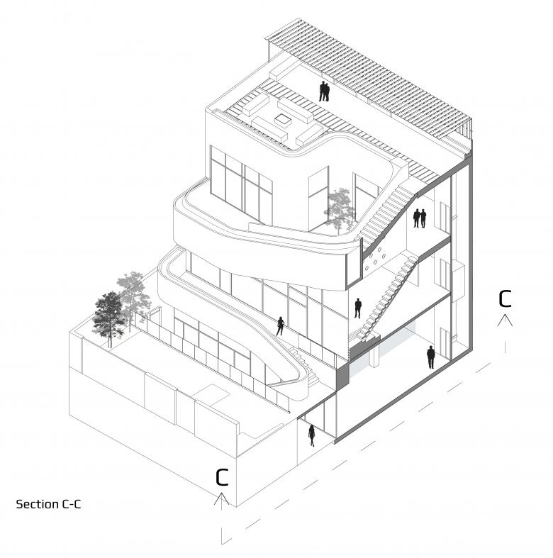 The architect says, “In the neighborhood, there was nothing relevant to attract my attention, but the traditional brick houses of the old town, with their generous terraces (mahtabi) were quite inspiring”. Her work tries to repropose, in a contemporary way, the ancient concept of the Iranian terraces. The house seems to be wrapped in a spiral-shaped rising terrace, which provides simultaneous protection against the sun's rays, space for outdoor activities, and dynamic views over the building and the landscape.