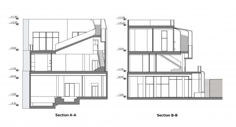 The house borders on three sides with the pre-existing properties. The southern side of the building, facing the, is the only place where the architect could realize her concept of multiple terraces, connected with ramps and stairs, creating a kind of promenade architecturale.