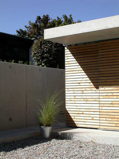 Die Aufgabe bestand nun darin, das Erdgeschoss mit einer neuen Nutzung zu versehen, es wurde zu einem großzügigen Raum für Besprechungen, Workshops und Präsentationen umgebaut. Ein Stampflehmofen von Martin Rauch bildet die Mitte des Raumes. Die Verbesserung der aussenräumlichen Situation war ein besonderes Anliegen der Bauherren. Die Stützmauer zur Reihenhausanlage musste erneuert werden. Die Ankunftssituation wurde mit einem vorgelagerten Carport in Sichtbeton und einigen Stellplätze für Besucher neu geordnet. Es entstand ein Zugang über einen kleinen abgesenkten Hof mit einer neuen Aussentreppe. Ostseitig wurde ein Terrassenplatz mit Blick in die angrenzende offene Wiese geschaffen. Alle neu durchgeführten Baumaßnahmen erfolgten in sorgfältig ausgeführtem Sichtbeton, teilweise in Betonfertigteilen.