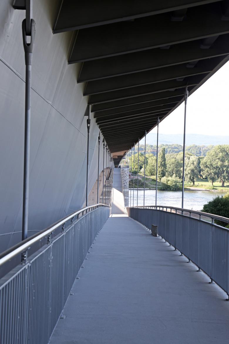 wie auch mit einer durchsichtigen Wand durch das Prinzip des Hohlspiegels eine Absorptionswirkung erzielt werden kann. Eine städtebauliche Besonderheit liegt in dem Angebot eines unter der Brücke hängenden Fußgängersteges, der Wiesbaden, die Rettbergsaue und Mainz attraktiv miteinander verbindet. So können Fußgänger und Rad- fahrer die Insel und die gegenüberliegenden Uferzonen ohne Beeinträchtigung durch Verkehrslärm erschließen. Eine besondere Attraktion sind zwei „Brückenbalkone“, die auf den alten, zu breiten Brückenpfeilern im Biebricher Fahrwasser errichtet werden und die einen besonderen Aussichtsplatz über dem Fahrwasser darstellen.