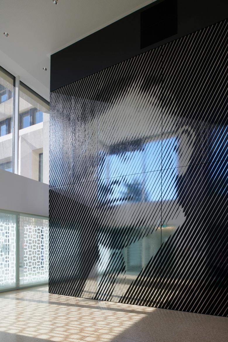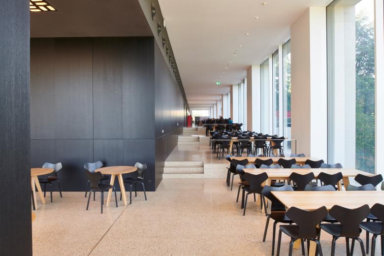 Die Fassade webt in ihren Proportionen, der Anordnung der Öffnungen sowie ihrer Materialität den Ausdruck des bestehenden Gebäudes in zeitgemässer Weise weiter. Das neue Erdgeschoss des Erweiterungsbaus und des Bestandes ist als offene und vielfältige Raumlandschaft mit Blick in den Park ausgebildet und beherbergt neu das Restaurant, Eingangshalle, Wartebereich, Foyer und die Schulungsräume.