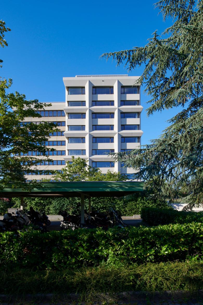 Das neue Ensemble steht, wie das die Planung aus den 80er Jahren vorgesehen hat, als Solitär im Park. Der Parc des Franchises wird vergrössert und um den Bereich zwischen dem Verwaltungsge- bäude und der Avenue Edmond-Voucher erweitert. Der Haupteingang liegt auf dem Weg in den Park.
