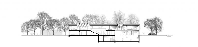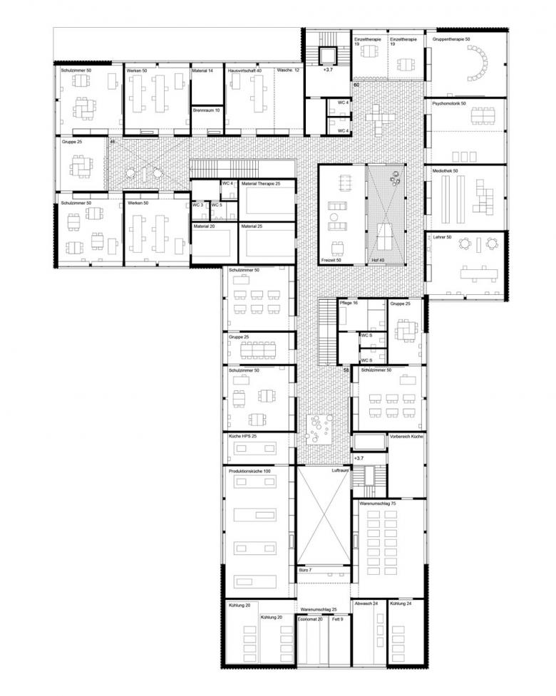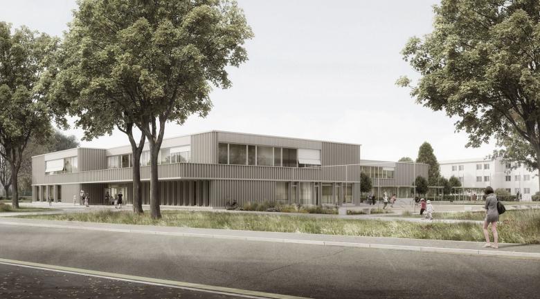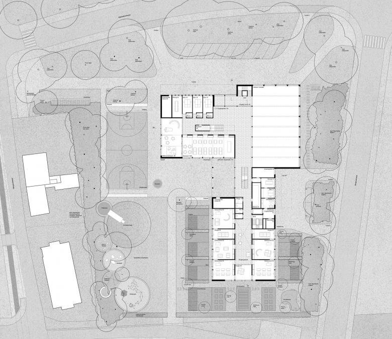 Die Nachbarschaft der neuen Heilpädagogischen Schule ist geprägt von Arealen und Siedlungen mit einem starken inneren Bezug. Die Regelschule nördlich der Parzelle ist ein rechtwinklig aufgebauter und gewachsener Campus mit einem internen Erschliessungsweg für Fussgänger und Fahrräder. Die neue Heilpädagogische Schule knüpft an dieses System an und schafft in der Verlängerung der Schulhauserschliessung eine Fussgängerverbindung auf das neue Schulareal, den Allwetterplatz, den Pausenplatz und die Gärten. Entlang der Statthalterstrasse verläuft die Vorzone der Schule, geprägt von den alten, hohen Bäumen und mit einer Durchlässigkeit, die eine klare Adressierung erlaubt. Das dreischenklige Schulhaus versteht sich als eine Erweiterung der bestehenden Schulanlage und ist gleich ausgerichtet. Mit der Positionierung im Nordosten der Parzelle entsteht an der Strassenkreuzung ein attraktiver neuer Platz und es bleibt eine grosse, zusammenhängende Fläche frei für den Schulgarten und die Spielwiese in der Tiefe der Parzelle.