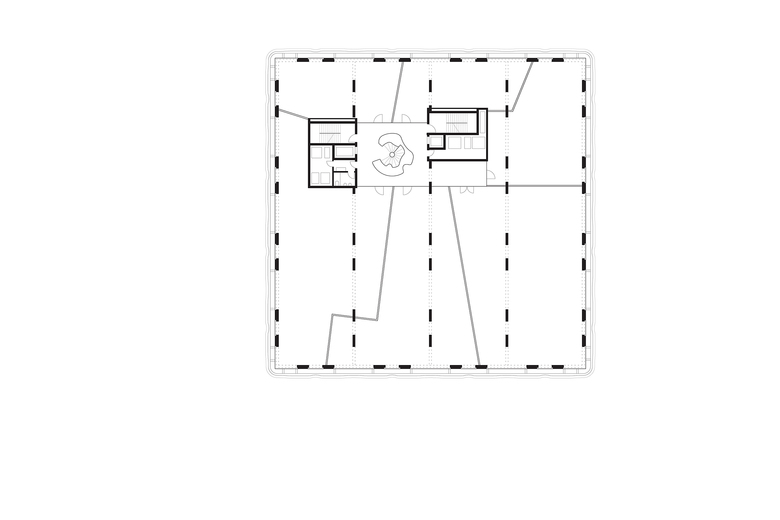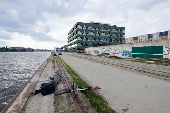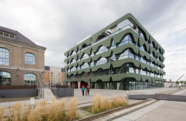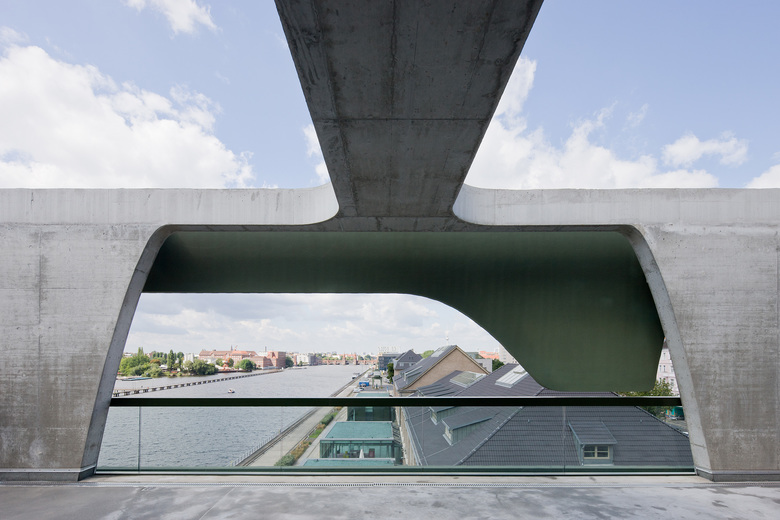 Connected by a heat exchanging device, the whole concrete structure of the building is permeated with water tubes and used as a radiator for heating as well as cooling. The energy consumption for heating and cooling of Labels 2 Berlin is reduced by 40% due to this combined technique of activating the building mass and using water from the Spree River. HHF architects won the international competition among selected architects in September 2007. The building opened in January 2010.