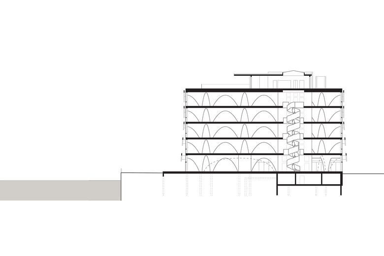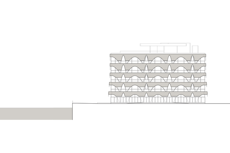 The use of two differently cut sine curves generates a specific aesthetic for both the supporting structure and, in a modified form, for the façade. The result is that the structure and rhythm establish a formative motif for the perception of the new building and link it to the existing neighborhood.