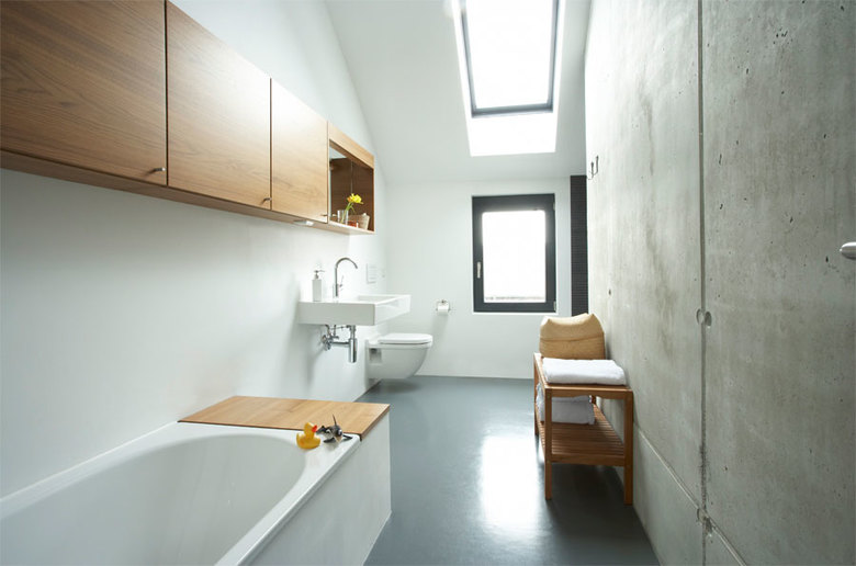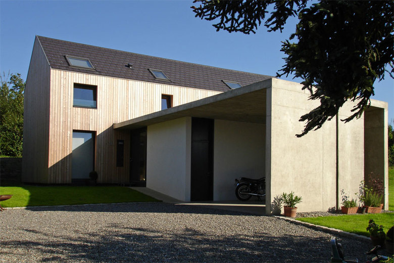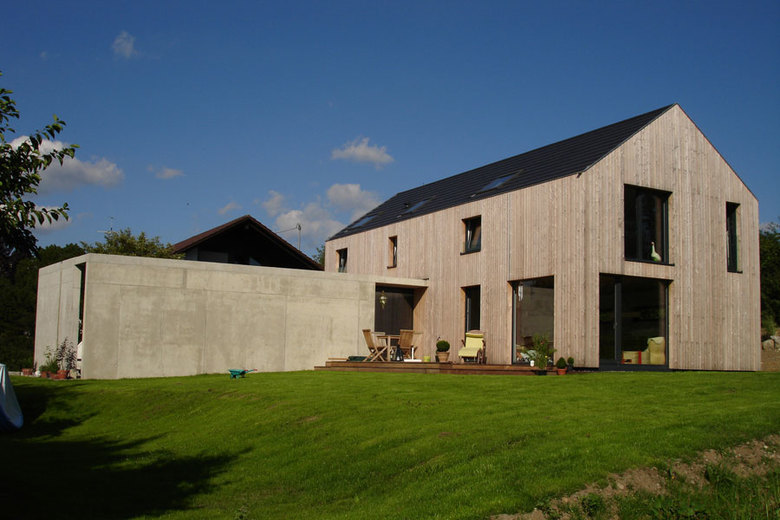 Das Einfamilienhaus liegt in ruhiger Umgebung am Ortsrand. Das nicht unterkellerte Gebäude mit Lärchenholzverschalung verfügt über einen Lagerraum und einen großzügigen Carport in Sichtbeton.
