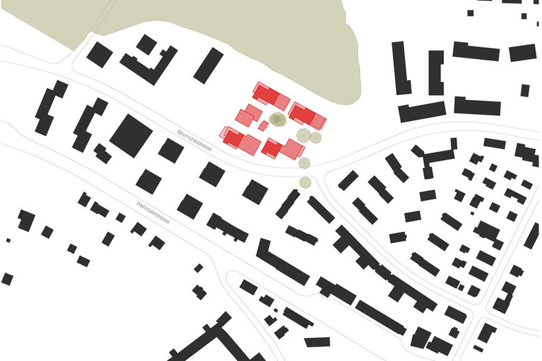 Die Setzung der Volumen richtet sich einerseits an die urbanen Ausrichtungen der bestehenden Bauten gegenüber der Binzmühlestrasse und andererseits wird eine grosse Durchlässigkeit zum angrenzenden Wald gewährt. Diese orthogonale Anordnung und die als Punktbauten in Erscheinung tretenden Körper, entsprechen der Sprache vor Ort. Durch die Gliederung entstehen vermehrt grosszügige Durchlässe in den innenliegenden Park. Der rückwärtige Wald wächst förmlich durch die urbane Siedlungsstruktur hindurch. Die geschützten Bäume und Baumgruppen integrieren sich harmonisch ins Siedlungsbild. So reagieren die Wohneinheiten in den verschiedenen Punkt- und Zwischenbauten immer auf die entsprechende Lage zum Park. Diese gewünschte und anzustrebende Grundrissgestaltung bietet neu eine grosse Artenvielfalt von Wohneinheiten. Grösse, Ausrichtung und die innere Organisation reagieren immer auf den Aussenraum.