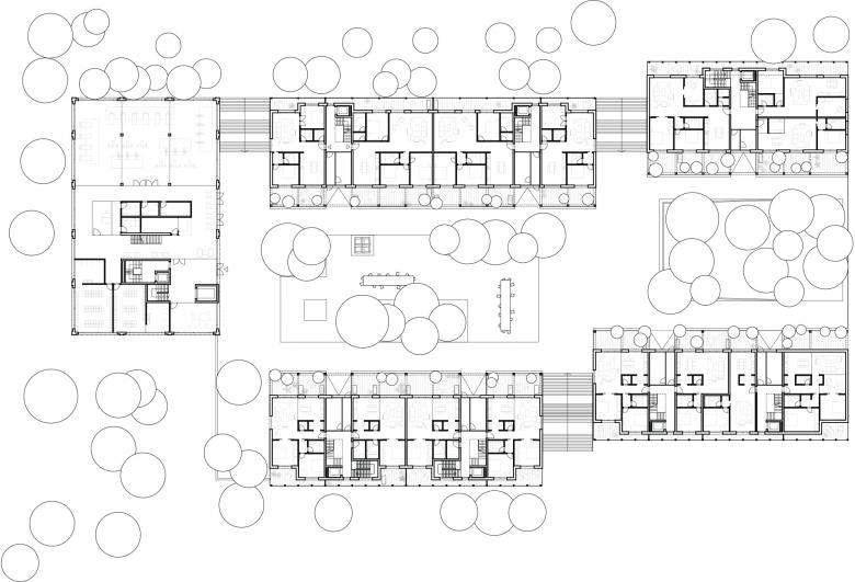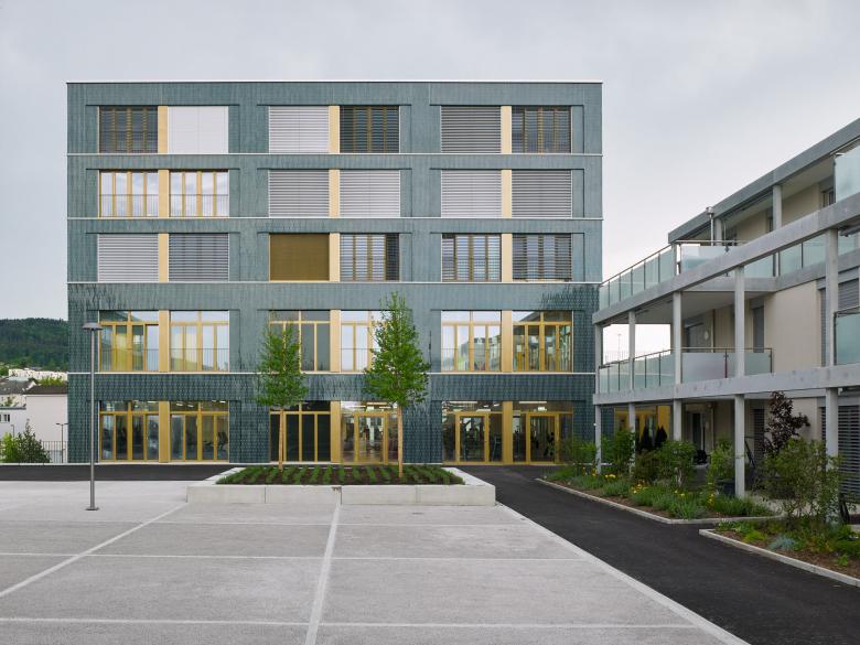 Das neue Gebäude bündelt unterschiedlichste Nutzungen und dient als Motor für das neue Zentrum; bietet aber dennoch vielfältige, voneinander differenzierte Nischen – einen Hof zum Spielen, eine Wiese zum Grillieren, eine Terrasse für den Sport, private Loggien und Balkone, Orte für Einkauf, Arbeit und für Begegnungen auf dem Areal und darüber hinaus.
