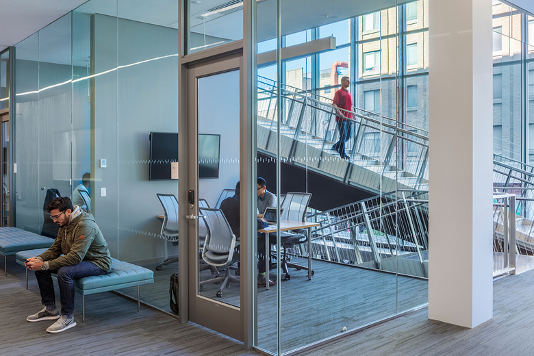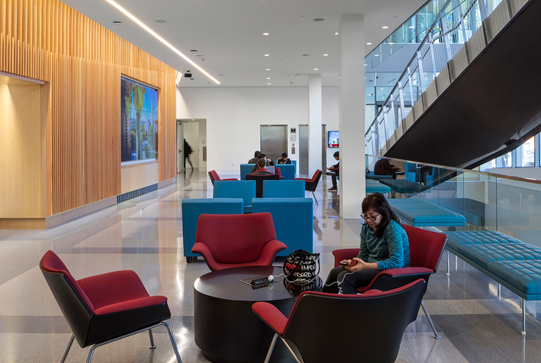 Located in the Collegetown section of Ithaca, New York, one block from Cornell’s main campus, the Breazzano Family Center for Business Education is a seven-story, 76,000-square-foot, twenty-first-century teaching and learning environment, and the first academic building to be built on this burgeoning precinct of the Cornell campus. State-of-the-art classrooms are supported by breakout rooms, faculty and student offices, social spaces, and a four-story atrium commons designed to accommodate a wide variety of events. The Breazzano Family Center’s top three floors provide enclosed offices for faculty and administrators, open office workstations, conference rooms and team rooms, and two broadcasting studios that transmit lectures and seminars to students in the Cornell Executive MBA Americas program.