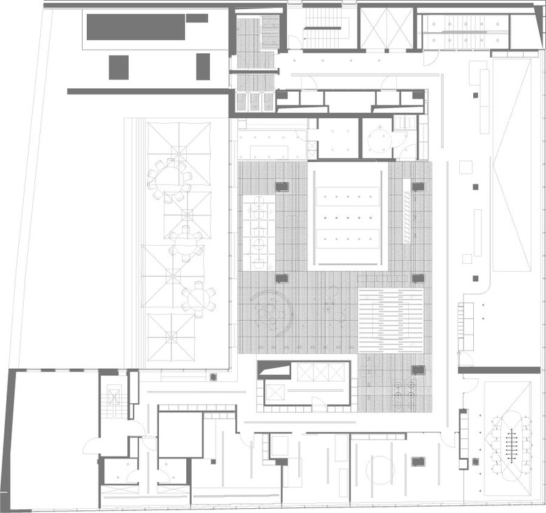 Das Zentrum bildet der große Essbereich mit zwei langen Tafeln und insgesamt 24 Sitzplätzen, die auf changierenden Teppichfliesen in drei unterschiedlichen Grau- und Brauntönen stehen. Darüber befindet sich ein abgehängtes Deckenfeld aus Akustikputz. Orthogonal zu den Tafeln schiebt sich ein Stehtresen wie ein optischer Riegel vor eine Gruppe aus kleinen Einzeltischen an der Fensterfront, die eine intimere Gesprächsatmosphäre bieten. Über diesen Tischen schwebt ein abgesetztes Lichtfeld. Das neongrüne Punktraster auf dem Boden stellt Assoziationen zu einer Wiese her und schafft so eine Überleitung zur Terrasse, die an einer Seite mit einer green wall abschließt. Zwischen Essbereich und Bibliothek bilden zwei behagliche Ohrensessel einen Rückzugs und Leseort. Beistelltischchen und drei langgezogene Lichttulpen unterstreichen den Wohnzimmercharakter. Daran schließt sich ein halbhoher Raum im Raum an: Ein Zylinder öffnet sich zur Terrasse hin und grenzt sich so vom Geschehen im Raum ab. Die akustisch wirksame Polsterung fördert hier das konzentrierte Gespräch, während der hochflorige Teppich, eine Lampengruppe und die Farbwelt in Bronze- und Rottönen eine behagliche Kaminatmosphäre schaffen. Den Gegenpol dazu bildet der quadratische Besprechungsbereich gegenüber, der durch das Lichtfeld an der Decke klar gefasst wird. Durch die nahezu transparenten Gitterstoffvorhänge wird dieser bewusst als halböffentlicher Bereich inszeniert. Frische Farben, der tiefblaue Tisch und ein rosafarbener Teppich versprühen hier inspirierende Lebendigkeit.