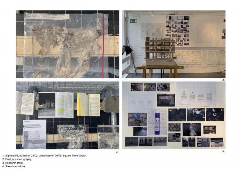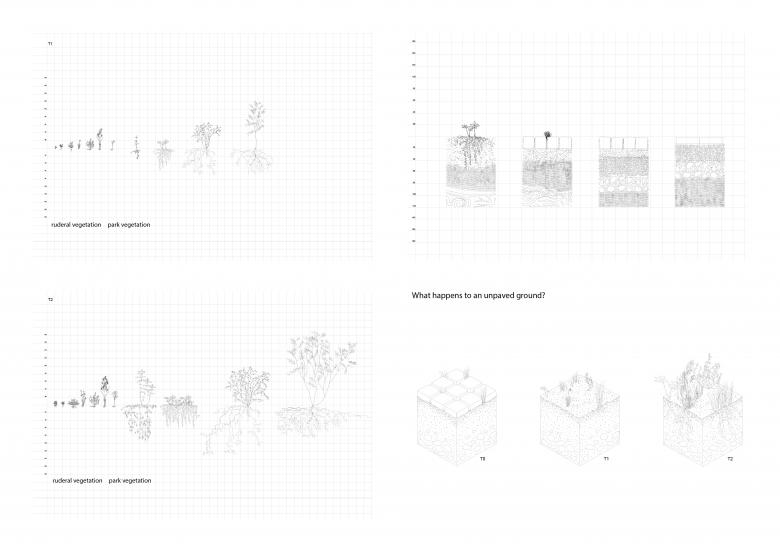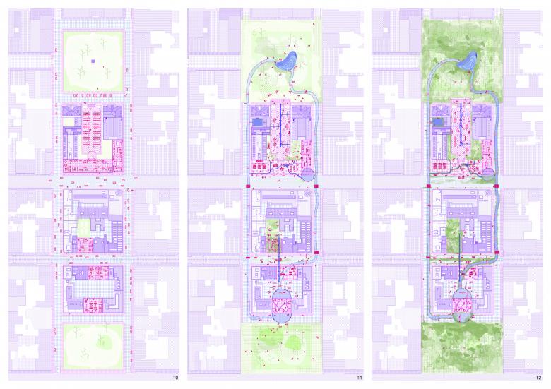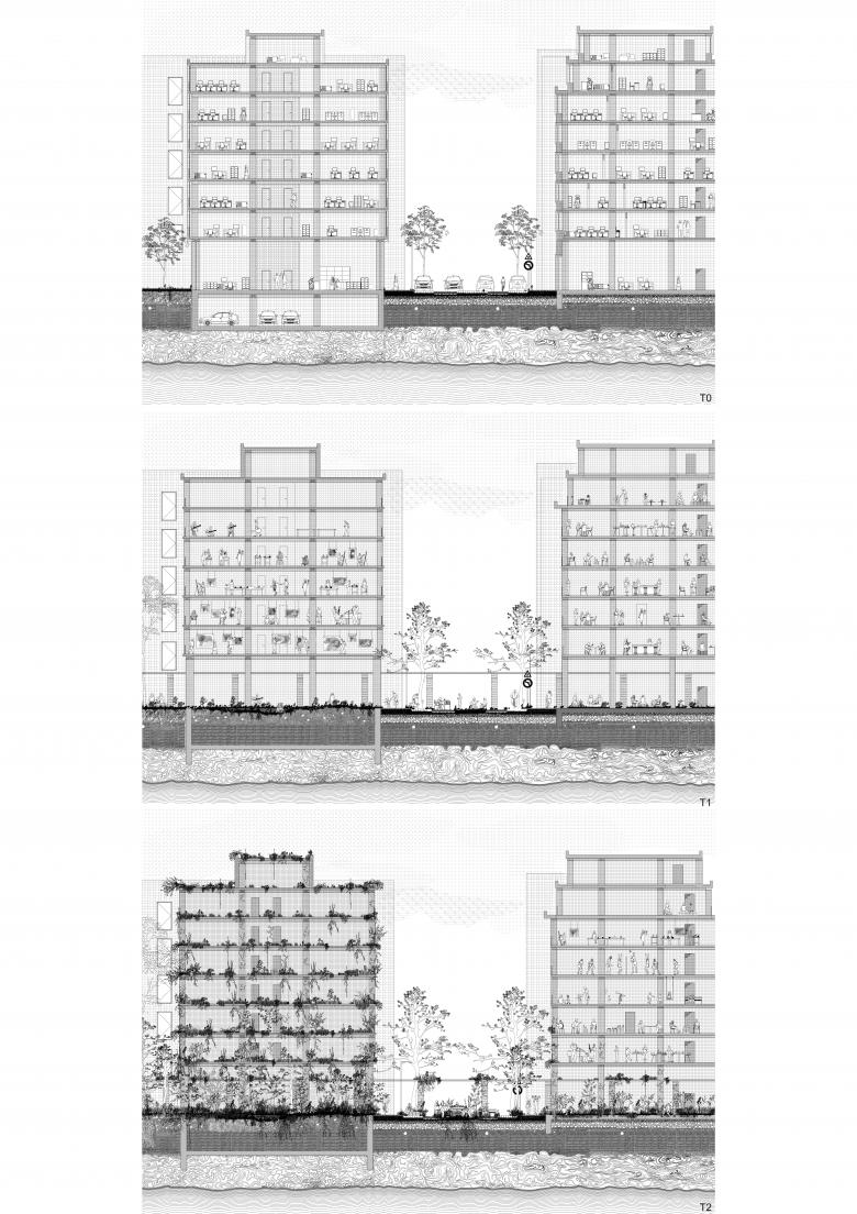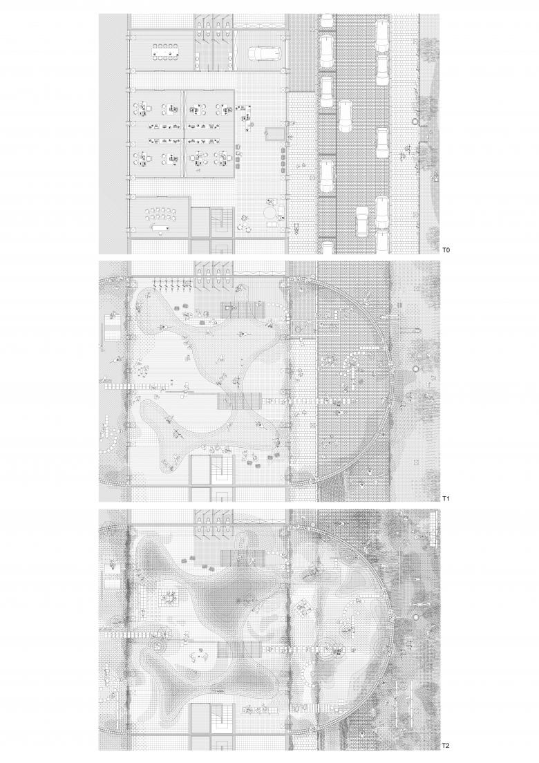 The project unfolds over an extended timeline through three phases: T0 (current state), T1 (initial interventions), and T2 (in 50 years). These explorations and iterations now allow us to anchor the project in a long-term perspective using degradation as a design tool. The goal is to transition from a gridded, monotonous city to an ecosystem shaped by an evolving landscape, welcoming otherness,blurring boundaries,and creating three-dimensional public spaces. A territory of friction between permanence and obsolescence, where soil transformation and water circulation redefine urban uses."